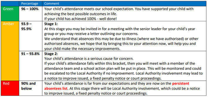 Parents / carers can keep up to date with their child's attendance via Weduc, this will show daily updated attendance information for your child. As part of our attendance procedures in school, we also adopt the use of the traffic light system to provide parents / carers with an easy to understand overview of their child’s attendance.